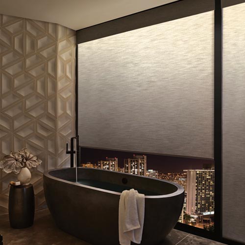 One of the latest innovations for roller shade features is Aura Illuminated Shades, which offer LED strip lights within the window shades. This feature provides a reflective interior that creates a glow at the window. The lighting can be adjusted for warmer or cooler lighting tones, as well as dimmed to create the ideal ambiance. Use these illuminated shades as regular shades–opening and closing when necessary, with filtered light or room darkening. Then, turn on the illumination feature when you want privacy, but also need interior lighting.